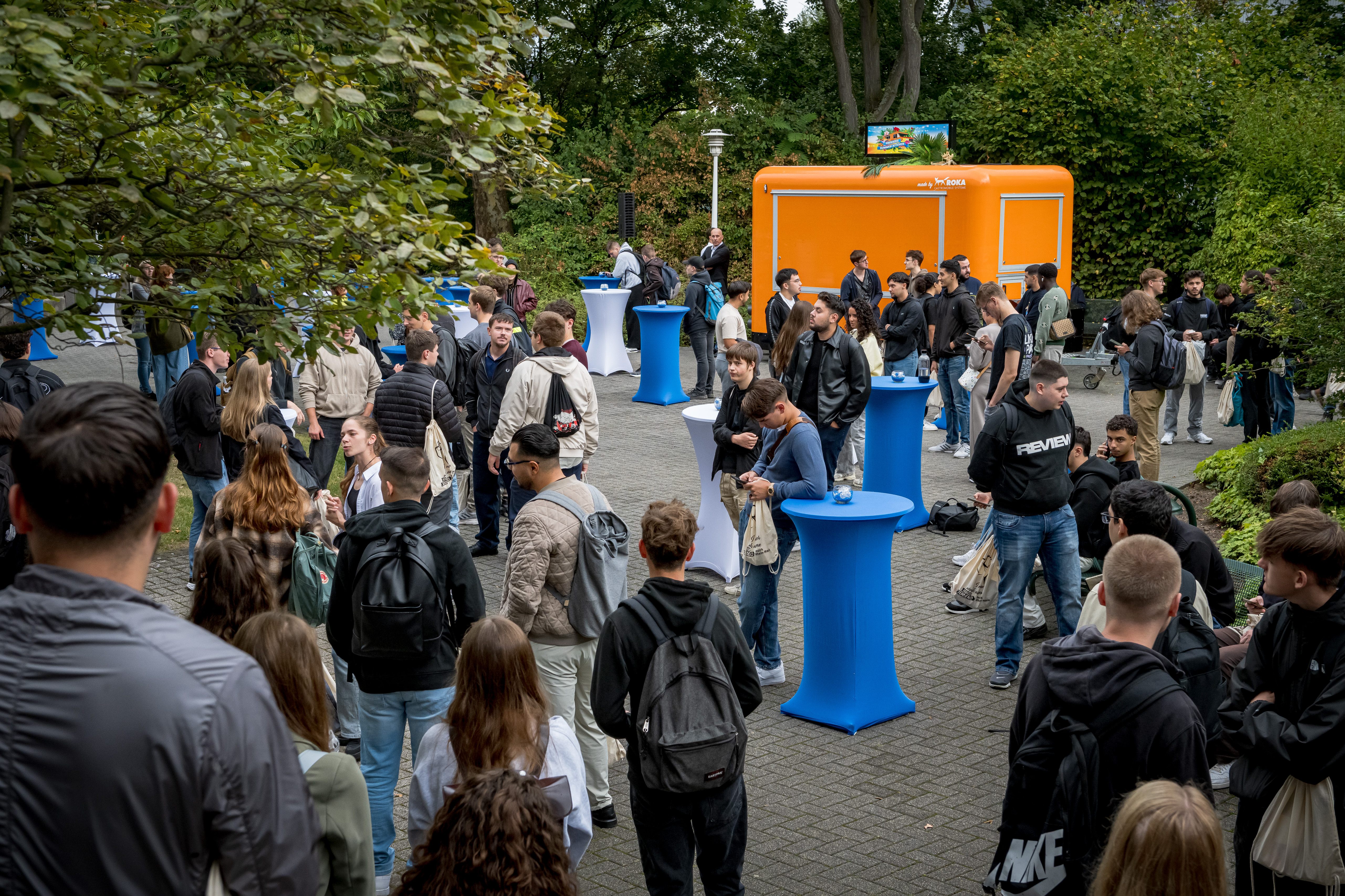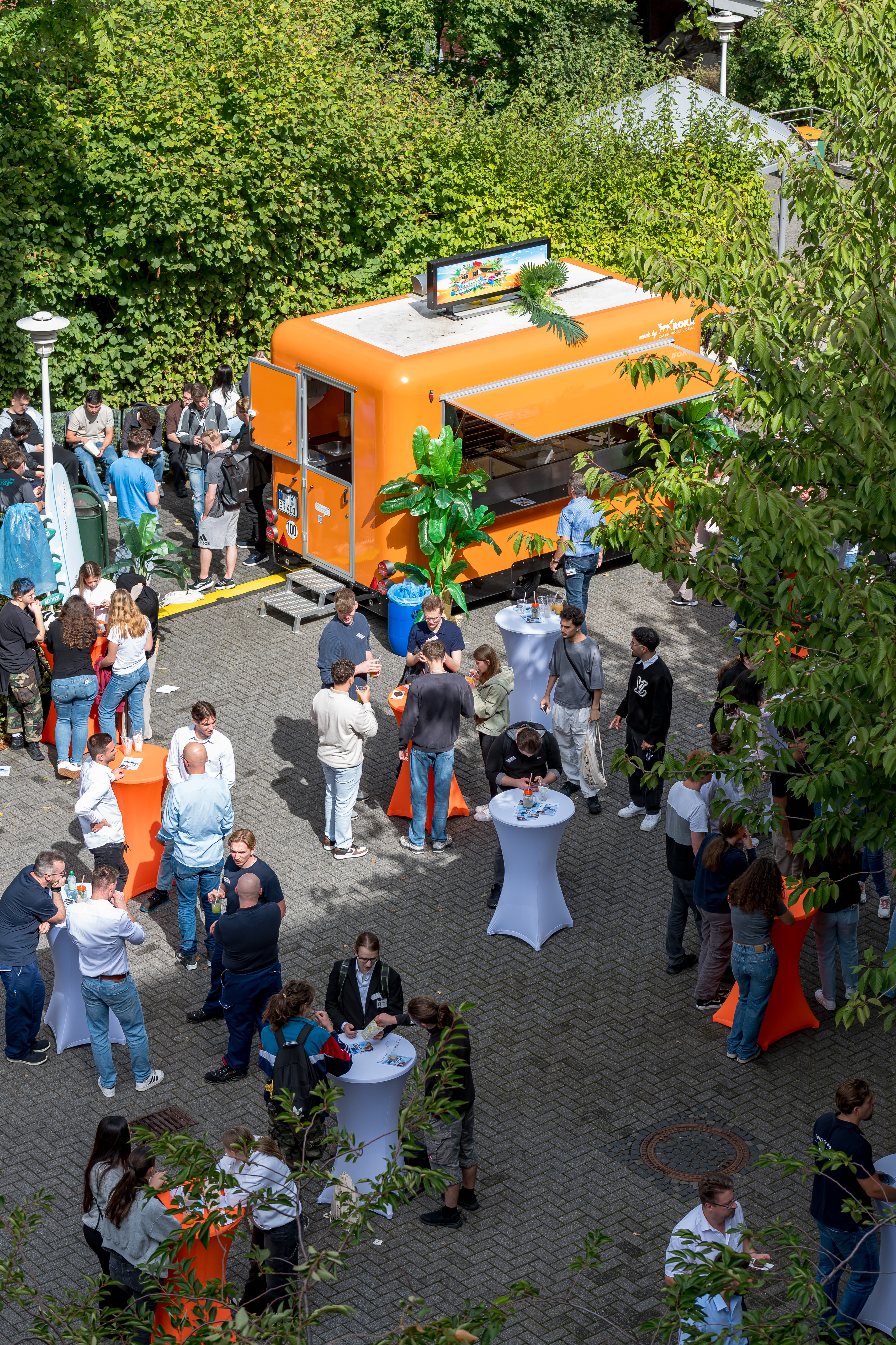 Der Welcome Day 2025 wurde – wie sollte es anders sein – von der Inhouse-Eventschmiede Provadis Corporate Events organisiert und durchgeführt. Dank der hohen Ausbildungszahlen herrschte regelrechte Festival-Atmosphäre auf dem Provadis-Campus: Nach den offiziellen Grußworten wurde bei DJ-Sounds mit alkoholfreien Sommer-Cocktails unter freiem Himmel gefeiert. Im Selfie-Mobil wurden Erinnerungsfotos geschossen und bei Rundgängen über den Campus die Provadis-Welt erkundet.