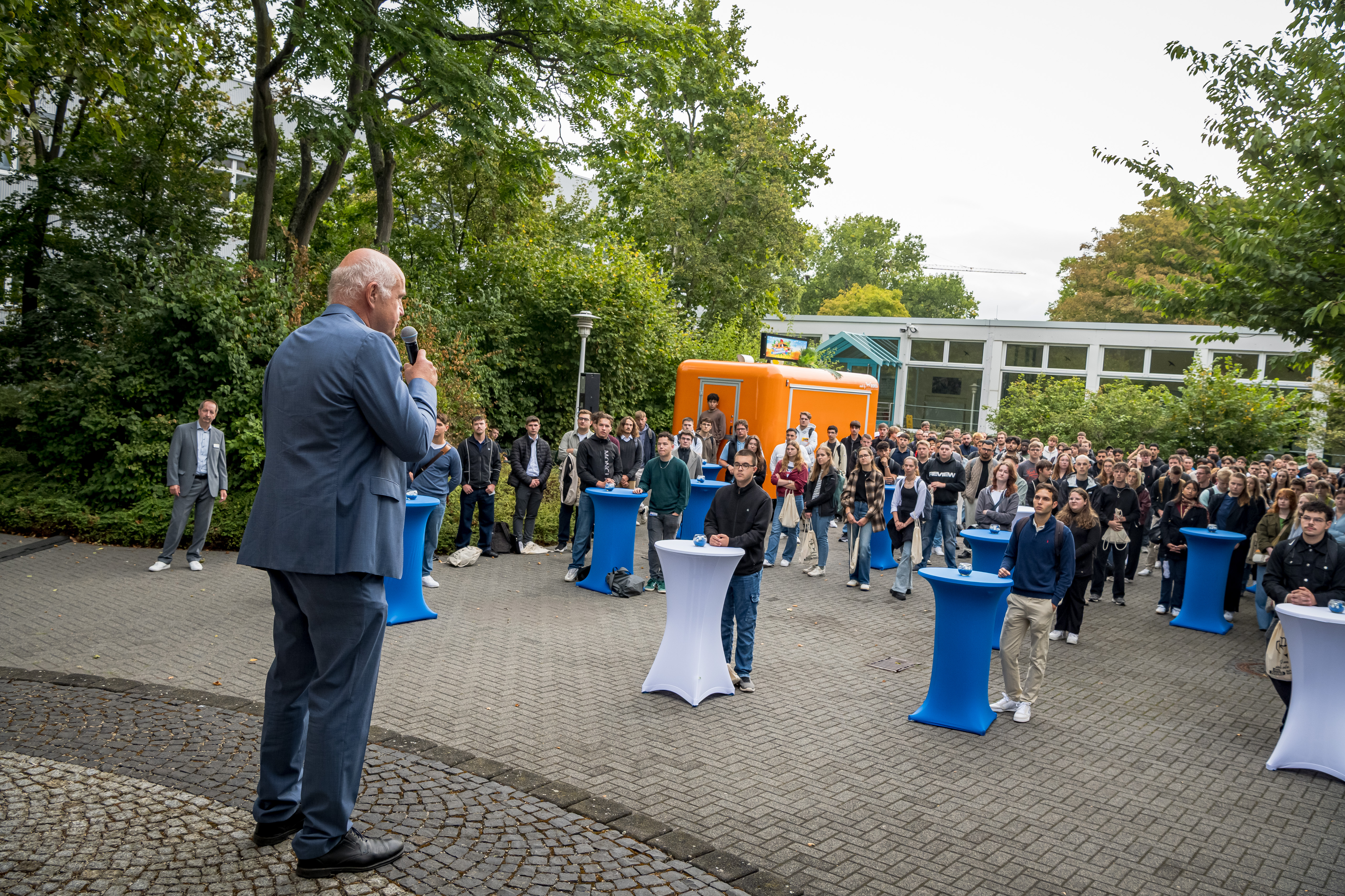 Geschäftsführer Dr. Udo Lemke begrüßte die neuen Auszubildenden: „Heute beginnt ein wichtiger Abschnitt in Ihrem Leben, und wir freuen uns, Sie dabei zu begleiten. Ihr Einsatz und Ihre Neugier sind das Fundament, auf dem Sie Ihre Karriere aufbauen werden. Halten Sie an dieser Begeisterung fest, dann stehen Ihnen viele Wege offen.” Neben solch motivierenden und zuversichtlichen Worten gab es jede Menge Party-Vibes: Musik und Entertainment, Snacks und Getränke. Und es wurden neben den offiziellen Fotos jede Menge Selfies geschossen.